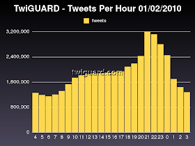 Special events like the football playoffs, awards shows, and politics can been seen in the twitter post statistics Twiguard collects. We can normally see some sort of spike, with the Grammys being no exception. We recorded 3.2 million tweets in a single hour which is way above the average of around 1.4 million tweets. To the left is a chart from 3am on Feb 1 showing the last 24 hour of tweet data we collected.