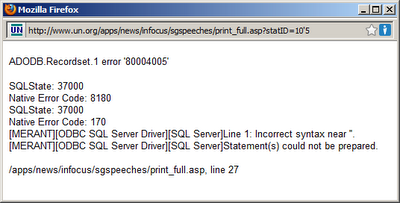 They have finally fixed the specific bug that led to their website being hacked (maybe because my blogpost last year was Slashdotted), but the site is full of similar SQL injection bugs. For example, if you click on "print this article", then use that URL instead, the SQL injection still works. This is shown in the picture below (using the URL http://www.un.org/apps/news/infocus/sgspeeches/print_full.asp?statID=10'5):