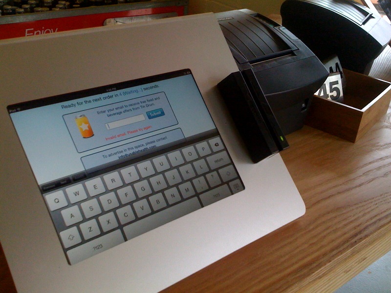 At a local eatery, instead of ordering lunch at the counter, I was confronted with an iPad ordering system. What you see in this picture is an iPad behind a credit-card reader, next to a device that prints receipts, next to a bin of numbers to put on the table so they know where to deliver the food.