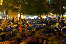 Every night is like a blowout bash you organized in college. After everyone has gone home or passed out, you sit on the top of the dorm with close friends, too excited to sleep, but too tired to do anything else but sit around in small groups and chat. That’s the vibe from the park at 2 a.m.: Quiet hours started at 10 p.m., most everyone has left, many are now asleep over there in the sleeping areas, but many are still too excited to go to sleep themselves. They huddle together in intimate groups around the park, discussing things.I think it’s the intimacy and restrained excitement at night that is part of the real story here, not the hubbub during the day that the press tries to mold into their narrative of just-another-protest. What makes this different are those protestors staying night after night in the park. Yet, news reporters flock the scene at 2 p.m., but are absent at 2 a.m. I can’t understand why somebody like the New York Times isn’t sending a reporter down there to embed themselves in the occupation, sleeping there for a week and perhaps writing a Pulitzer prize-winning story.