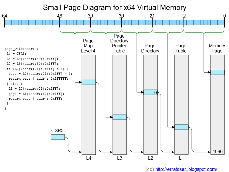 This register points to a 4096-byte block of memory (called "Page Map Level 4" or simply "L4" in the diagram) that contains 512 pointers, each 8 bytes in size. Remember that we need 8 bits to store a byte having 256 combinations, that means we need 9 bits to address 512 combinations. Thus, we grab the first 9 bits of our 48-bit address, then to a lookup in the L4 table, and thus find a pointer to our L3 table.