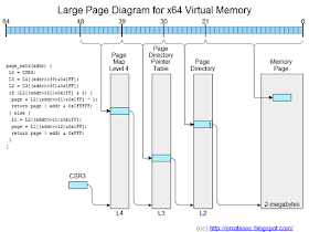 Lucky for us, we can skip the L1 stage. Page table entries are a full 64-bits in size, but they only ever use the high-order bits. They don't use the low-order bits, except as status flags. The lowest bit is a flag that means "skip the next level". This is showing in the following diagram, where the L2 lookup leads directly to a 2-megabyte page, rather than than to an L1 lookup to a 4096 byte page: