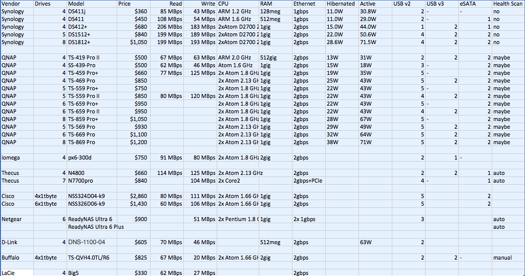 A company called “Drobo” is a major home RAID vendor, but they sell products that connected directly to the desktop via USB, eSATA, or Thunderbolt, so they weren’t on my list.