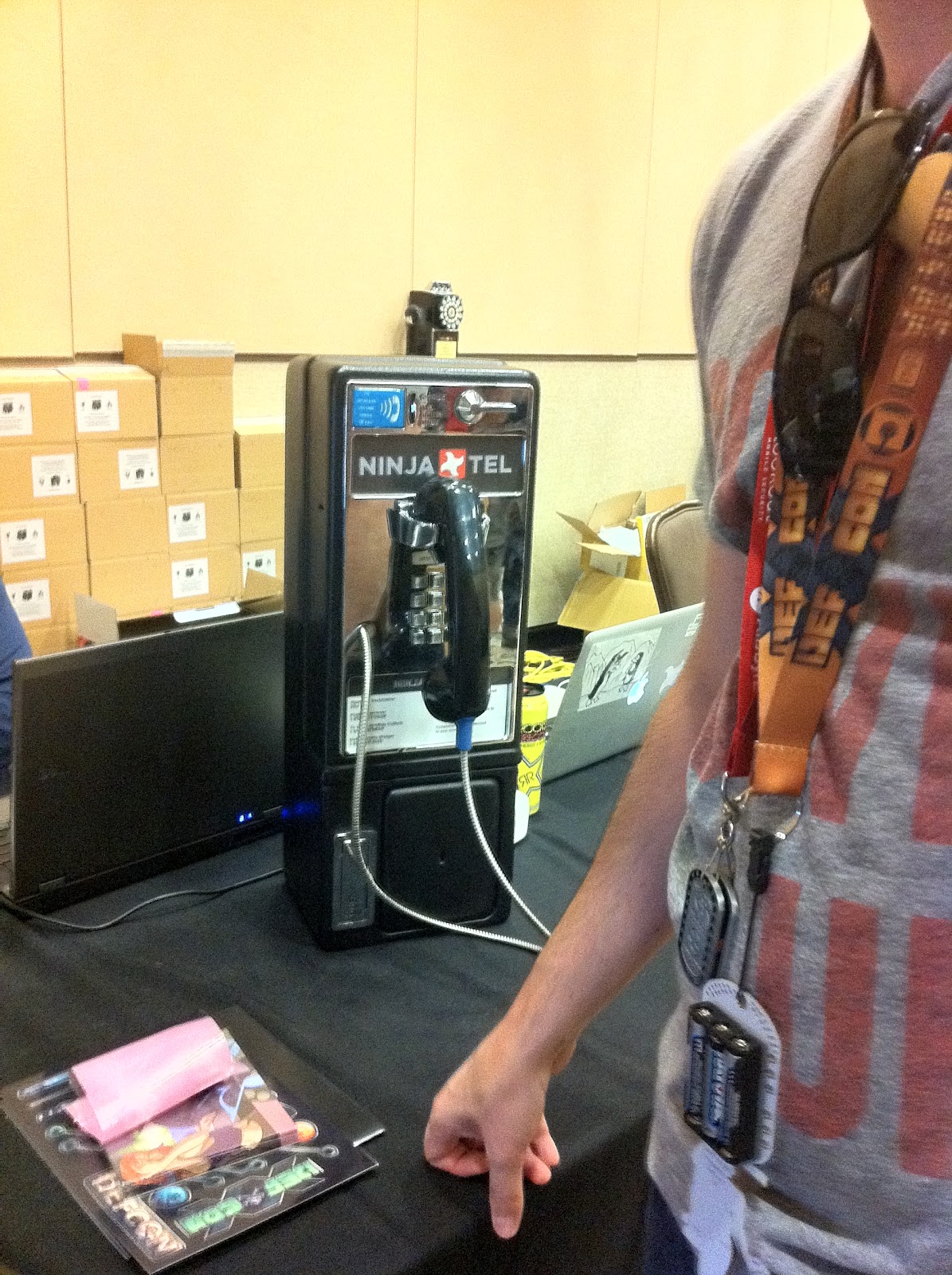 The carrier is "ninjatel". They have a freaking van in the back of the vendor area that's the mobile tower. The van is full of equipment, with a USRP, OpenBTS, and Asterisk (the usual suspects).