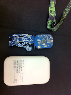 It comes in a white box. Puny normal Defcon badge next to it for size comparison. (anybody know an easy way to rotate this picture and retain EXIF info?)