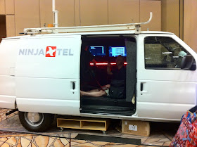 The carrier is "ninjatel". They have a freaking van in the back of the vendor area that's the mobile tower. The van is full of equipment, with a USRP, OpenBTS, and Asterisk (the usual suspects).