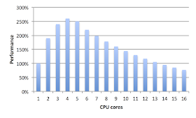 This post talks about scaling code past the four-core limit. Instead of the graph above showing performance falling off after four cores, these techniques lead to a graph like the one below, with performance increasing as more cores are added.