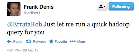 This all took place within 30 minutes from start to finish. It's possible because we tool using homos have opposable thumbs that can grasp the blogs, the twitters, the github, and the hadoop. I don't know how many servers @jedisct1 has at his disposal, but in theory, with a few keystrokes, he could reach into the cloud (like Amazon's service) and marshall a thousand machines equalling a million dollar super computer to answer this small question for me.