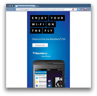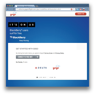 That’s an interesting debate, but there is a further twist: GoGo Inflight’s promotion violates their own Terms of Service (ToS). According to the ToS, you need a "user account" to use the service. However, the Blackberry promotion doesn't give you one, because it triggers off the browser ID. Thus, even if you have a valid Blackberry (and aren't cheating), you are still technically in violation of the Terms of Service.