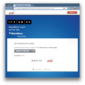 That’s an interesting debate, but there is a further twist: GoGo Inflight’s promotion violates their own Terms of Service (ToS). According to the ToS, you need a "user account" to use the service. However, the Blackberry promotion doesn't give you one, because it triggers off the browser ID. Thus, even if you have a valid Blackberry (and aren't cheating), you are still technically in violation of the Terms of Service.