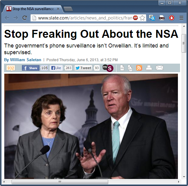 The picture at the top of this post shows two Senators, one a Democrat and one a Republican, who are on the relevant committees to tasked with NSA oversight. While of opposing parties, they are both notorious for their disregard of civil rights. That increases the irony of the Saleton post, that he'd use these Inner Party members as an example of what the NSA surveillance isn't Orwellian.