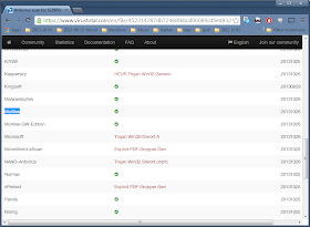 Now I take the infected brief and upload it to "VirusTotal", a website that tests files across a wide variety of anti-virus products to see if it can be detected. As you can see, because I'm being stupid here not actually trying to evade AV, some products actually catch this trojan/exploit. But not McAfee, the one Hanni used to certify his file free of viruses. Hanni's certification applies not only to his virus-free brief, but my infected one, too.