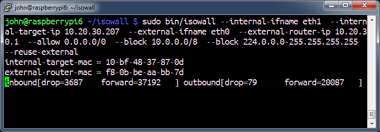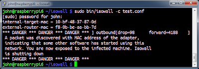Isowall is for the paranoid. Let's say that you fear the smartest hackers in the world have infected your laptop. You want to connect it to the Internet to so you can analyze what it's doing, but you don't want the infection to spread. Isowall is probably the best guarantee you'll get.Notes: In the above demonstration, notice the option "--reuse-external". Isowall is actually intended for use in systems with three adapters, where you control the system over 'eth0', then bridge between 'eth1' and 'eth2'. However, the Raspberry Pi has power issues, and can't always power two additional Ethernet adapters. Thus, I use 'eth0' both for the control connection (with an operating system IP address) and the 'external' network. This is perfectly secure as far as I can tell, though it breaks the model a bit.