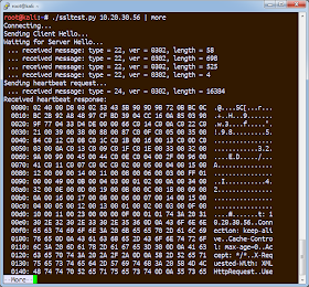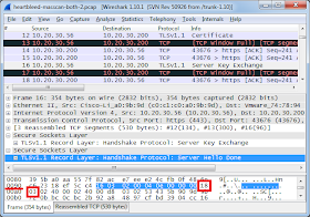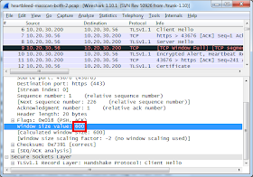 This causes the server side to buffer the send() requests in the kernel. Normally, we should be seeing some separate packets at this point, such as a "Server Certificate", "Server Key Exchange", and "Server Hello Done" message, followed by the "Heartbeat" response. Because of the small window, the server has combined these all together and streamed them across the connection. In frame #16, we see the result, with the pattern |18 03| at offset 0x009F in packet.