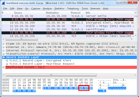 You can see this in action within this packet-capture using Wireshark. Frame #10 is where masscan transmits the Heartbeat request. It combines this with an Alert request, thus pushing the |18 03| pattern seven bytes deeper into the packet. This evades detection when the packets are sent to the server.