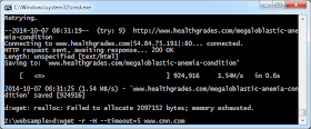 Well, for a 32-bit bit process, what happened is that after more than a month, it ran out of memory. It maintained an ever growing list of URLs that it has to visit, which can easily run in the millions. At a hundred bytes per URL and 2-gigabytes of virtual memory, it'll run out of memory after 20 million URLs -- far short of the billions on the net. That's what you see below, where 'wget' has crashed exhausting memory. Below that I show the command I used to launch the process, starting at cnn.com as the seed with a max timeout of 5 seconds.