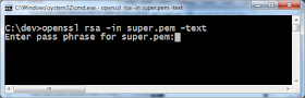 At this point, I copied/pasted the certificate into a file super.pem. I then attempted to look at it using OpenSSL. However, I was presented with a password prompt. This file has been encrypted with a password.