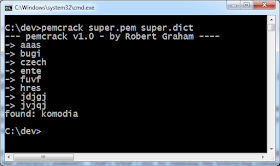 Okay, that's annoying, but that just means we need to crack the password. However, I can't find a password cracker on the Internet that handles SSL PEM files, so I wrote my own certificate password cracker. It's pretty bad, using the OpenSSL decrypt API in a single thread, so it's not pretty. But it's sufficient for my needs.