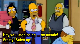 This is similar to the Simpsons episode where Germans buy the power plant. In fear for his job, Homer (the plant's Safety Inspector) starts going around telling people to "Stop being so unsafe!".