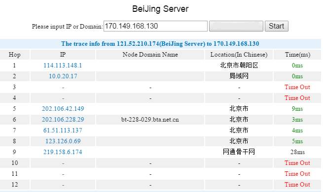 The next step is to traceroute in the other direction, from China to a blocked address, such as the http://www.nytimes.com address at 170.149.168.130. Using the website http://www.linkwan.net/tr.htm, I get the following: