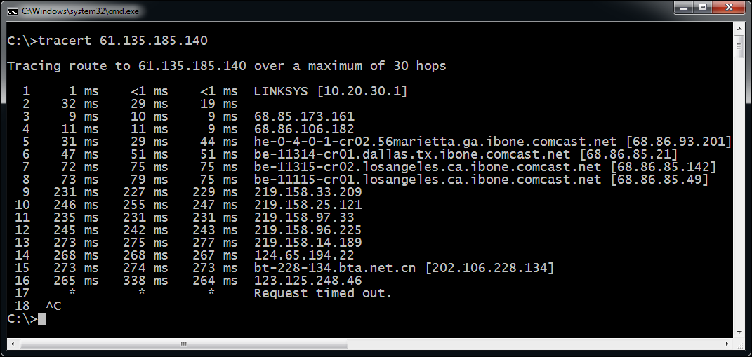 The second column is time. As you can see, it takes almost 80-milliseconds for my packets to reach Los Angeles, and then the delay jumps to 230-milliseconds to reach China. Also note that I can't quite reach the server, as there is a firewall after hop 16 that is blocking traceroute from working.