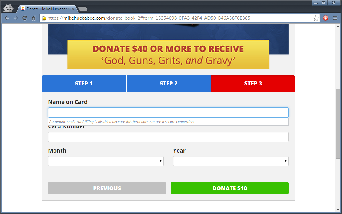 Conversely, Bernie Sander's website gave the impressing of a bumbling old grandpa that still doesn't understand the Internet. Mike Huckabee had its own set of problems, namely SSL errors meaning his forms weren't securely submitting credit card numbers.