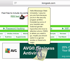 The April Fools joke was funny. Had it been done by someone with no reputation of being an misogynist in the first place, I don't think it would have caused the drama it did. Unfortunately irongeek did and does have that reputation for many offensive things he has said to and about women in many formats over many years. The April fools joke was kind of poking fun of that, that is where is crossed the line and people, and from what I remember (I could be wrong memory is funny that way) mostly women, got pissed. That context is missing in your post and I think it is important. The pop up that caused it this time around also included horrible misogynist language, for no good reason even. If he gave a screw you and your college message I don't like this one teacher it would have been different I think. People would have still gave him crap for blocking students who don't even know about this drama but that would have been about it. The unfortunate fact is the guys attitude and language about and to women has been and continues to be inappropriate. He doesn't see that and doesn't change because his good works have gotten him a ton of friends who defend him as a good guy and never call him out instead hide behind it is his site and censorship and we don't always have to be PC all the time arguments.Therefore this was going to blow up again and again and again. Dealing with it three blow ups from how would have been worse for B-Sides LSV than doing it now and what they did makes sense to me. The only think I wish they would have done is wait until after DerbyCon. I predict DerbyCon is going to be a Bro's anti-PC which is code for being jerks conference now which is unfortunate, but we will see, maybe they will take a deep breath and move on instead.