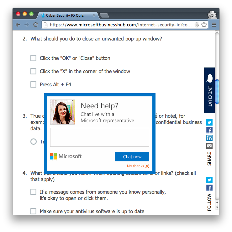 Whenever you visit this website, on pretty much any page as far as I can tell, you are going to get this popup asking to chat after a few minutes. At first I thought it was tied to this question (which would be clever), but it isn't -- it's a site-wide thing, unrelated to this quiz.