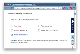 At the bottom of that article is a link to this "Cyber Security IQ" quiz at Microsoft's small-business website. The first question asks about password sharing. I show their "right" answer here: