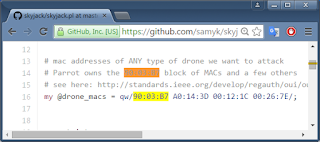 You can see this in the screenshot below, were we see the output of a hacking program that monitors the raw WiFi traffic. The AR Drone acts as an access-point so that your iPhone can connect to it in order to fly the drone's controls. The Tesla, on the other hand, is looking for an access-point named "Tesla Service", so that when you drive it in for service, it'll automatically connect to their office and exchange data. As you can see, both devices have the same vendor code of "90:03:B7" for Parrot SA.