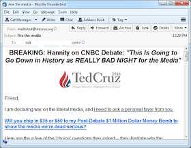 Here's Ted Cruz's email, sent to my Perry account. It's actually identical to one I received on my Cruz account. (I've hidden the To: address, except for the 'rick' part).
