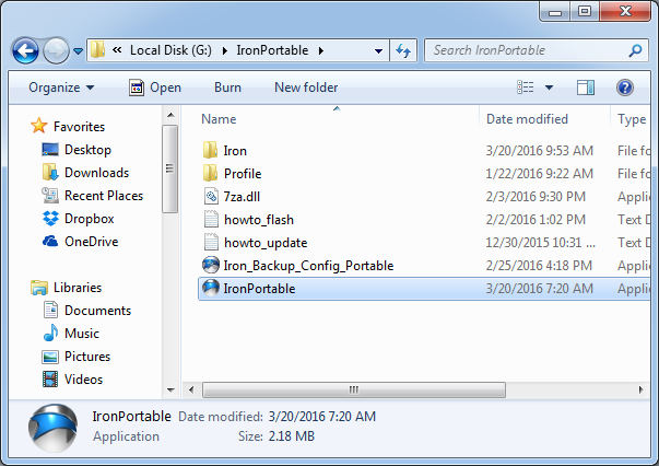 Then the terrorist runs a 'portable' web-browser from the G: drive. These are browsers based on Chrome or Firefox that run completely self-contained from a directory, leaving behind no other trace on the system. In this example, I'm using "Iron Portable", which is based on Chrome. All the settings, like which website to log into, and possibly saved passwords, are stored in this directory. Likewise, any logs will be stored here.