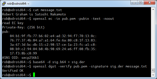 Now, when hashed an signed, the results from openssl exactly match the results from that old Bitcoin transaction. Craig Wright magically appears to have proven he knows Satoshi's private-key, when in fact he's copied the inputs/outputs and made us think we calculcated them.