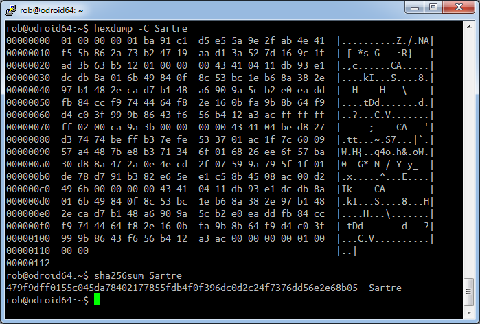 The sha256sum result is the same in both cases, so either I'm lying or Craig Wright is. You can verify for yourself which one is lying by creating your own Sartre file from this base64 encoded data (copy/paste into file, then base64 -d > Sartre to create binary file).