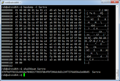 But here's the clever bit. If you've been paying attention, you'll notice that the Sartre file has been hashed twice by SHA256, before the hash has been encrypted. In other words, it looks like the function: