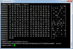 But here's the clever bit. If you've been paying attention, you'll notice that the Sartre file has been hashed twice by SHA256, before the hash has been encrypted. In other words, it looks like the function: