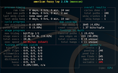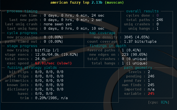 As you can see, the command that returns in 10ms is now hanging when run under AFL, which says that it doesn't return in 1000ms. Using the '-t' option to increase the timeout doesn't help. Running masscan in some other way, such as parsing configuration files, works just fine.