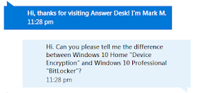Wait, what? What's the difference between "Device Encryption" and "BitLocker"? I though BitLocker was Device Encryption?? Well, the purchase screen for Windows 10 has this friendly little pop out offering to help. Of course, as a techy, I know that such things are worse than useless, but I haven't tried one in a while, so I thought if I'd see if anything changed.