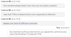 At this point, he's acting as a Markov bot, searching Microsoft's internal site with the terms I give him, then selecting random phrases to spew back at me, with no understanding. Support for TPM has nothing to do with the difference.