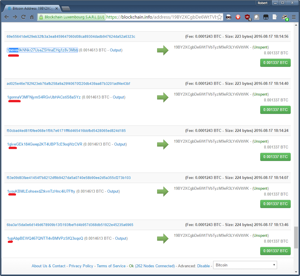 So yeah, these accounts as far as I can tell so far without going and spending way to many fucking hours on bitcoin.ifo or some such site, were created to purposely rick roll and fuck with the ShadowBrokers. Now, they may be fractions of bitcoins but I ask you, who the fuck has bitcoin money to burn here? Any of you out there? I certainly don’t and the way it was done, so tongue in cheek kinda reminds me of the audacity of TAO…Who has bitcoin money to burn? The answer is everyone. Krypt3ia obvious isn't paying attention to the value of bitcoin here, which are pennies. Each transaction of 0.0001337 bitcoins is worth about 10 cents at current exchange rates, meaning this Rick Roll was less than $1. It takes minutes to open an account (like at Circle.com) and use your credit card (or debit card) to $1 worth of bitcoin and carry out this prank.
