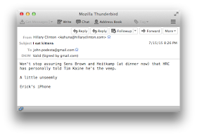 Let me get ahead of the lamers and point to more sophisticated stuff that also doesn't count. The following DKIM verified email appears to say that Hillary admitting she eats kittens. This would be newsworthy if true, and a winner of this bounty if indeed it could trick people.