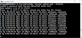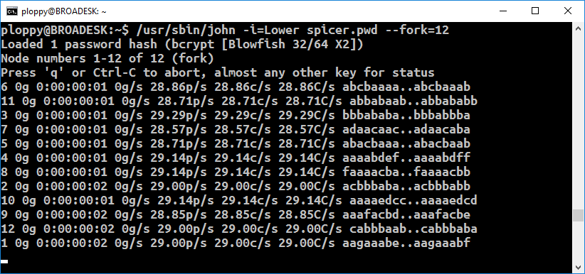 I tried the same sort of setup using John-the-Ripper in incremental mode. Whereas Hashcat uses the GPU, John uses the CPU. I have a 6-core Broadwell CPU, so I ran John-the-Ripper with 12 threads.