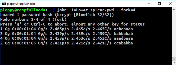Would a massive IoT botnet help? Well, I tried out John on the Raspbery PI 3. With the same settings cracking the password (at default difficulty), I got the following:
