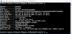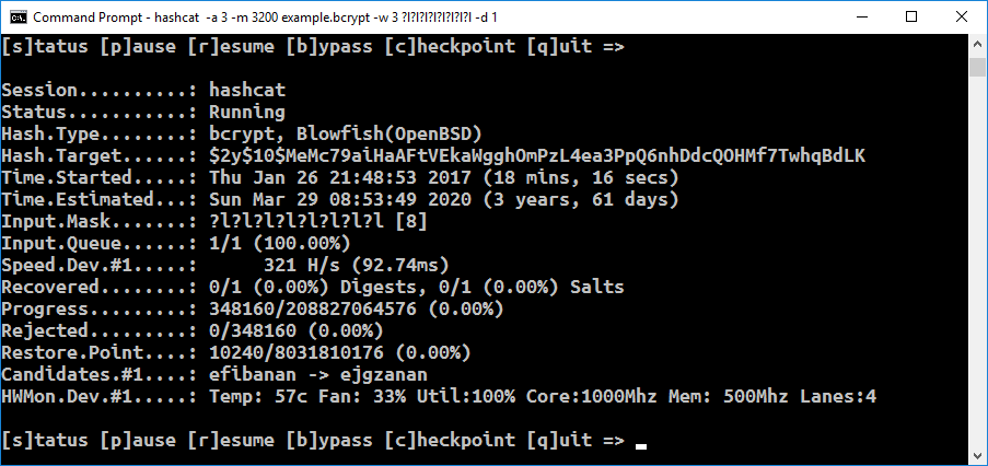 As you can seem, I'm brute-forcing an eight character password that's all lower case (-a 3 ?l?l?l?l?l?l?l?l). Checking the speed as it runs, it seems pretty consistently slightly above 300 hashes/second. It's not perfect -- it keeps warning that it's slow. This is because the GPU acceleration works best if trying many password hashes at a time.