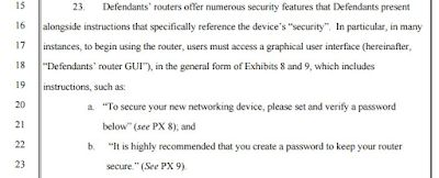 The key point I'm trying to make is that D-Link can resolve the suit (in theory) by simply removing all claims of "security". Sure, it can claim it supports stateful-inspection firewalls and WPA2, but not things like "WPA2 security". (Sure, the FTC may come back with a new lawsuit -- but it would solve the points raised in this one).