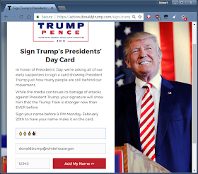 Thus of us who donated to Donald Trump's campaign (note: I donated to all candidates campaigns back in 2015) received an email today suggesting that to honor Presidents Day, we should "sign a card" for Trump. It's a gross dis-honoring of the Presidents the day is supposed to commemorate, but whatever, it's the 21st century.