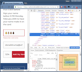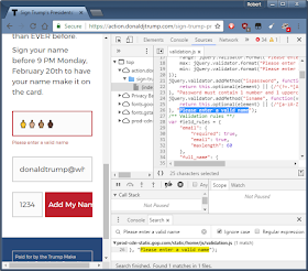 Okay, now we hit the submit button "Add My Name" in order to send this to his campaign. The only problem is, the web page rejects us, telling us "Please enter a valid name" (note, I'm changing font sizes in these screen shots so you can see the message):