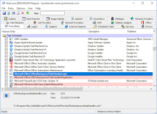 We can see it's started by the "Schedule" service. This means we can go look at it with "autoruns.exe", another Sysinternals tool that looks at all the things configured to automatically start when you start/login to your computer.