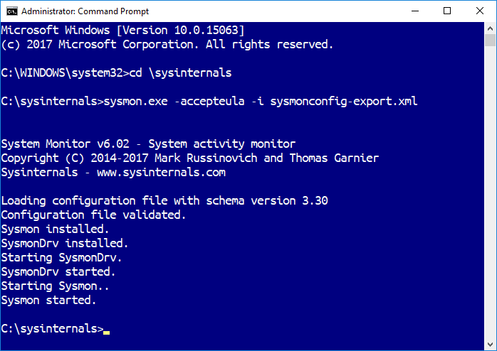 sysmon.exe -accepteula -i sysmonconfig-export.xml