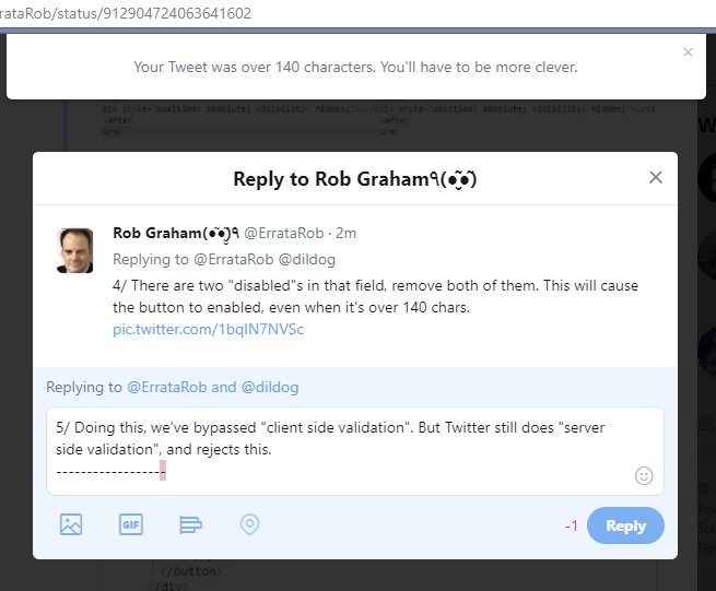 But Twitter still does server-side validation as well. They know any client-side validation can be bypassed, and are in on the joke. They tell us hackers "You'll have to be more clever". So let's be more clever.